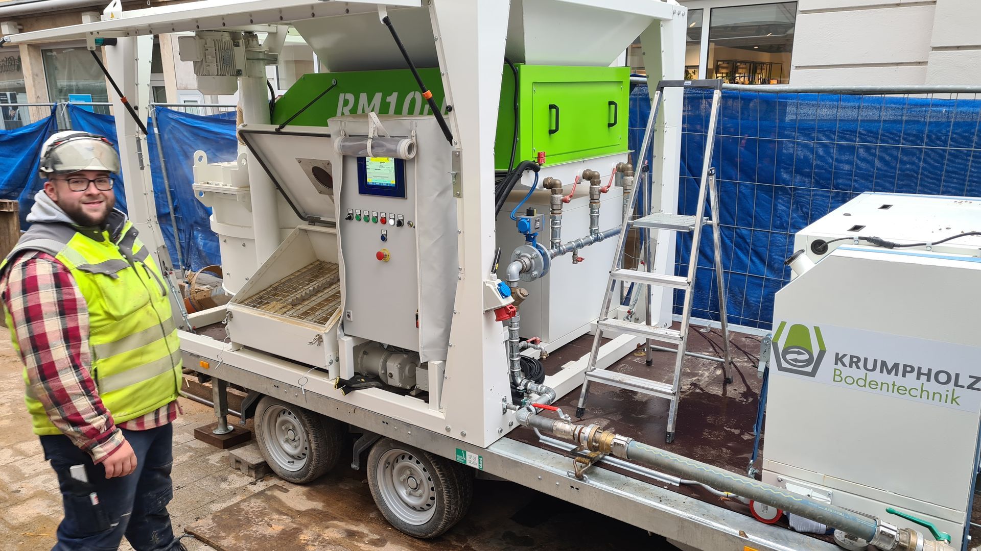Mit der RM 10plus sind wir sehr flexibel. Sie kommt vor allem innerstädtisch oder auf Baustellen mit einem beengten Baufeld zum Einsatz. Mit ihr werden vor allem Rohrgräben und Baugruben mit ZFSV* verfüllt.